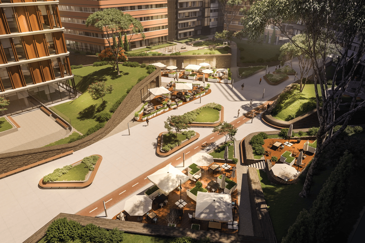 This space acts as a central connector, seamlessly linking the various functions within the development with the surrounding parks, enhancing the experience for both office workers and residents.