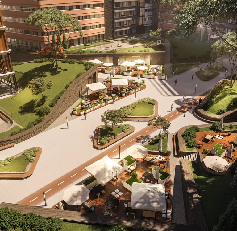 The office buildings are strategically positioned along the main boulevards, serving not only as prominent business hubs but also as a buffer that shields the inner residential areas from noise. At street level, the complex includes commercial and public spaces designed to bring life to the area, fostering social interaction and creating a vibrant, community-oriented atmosphere.