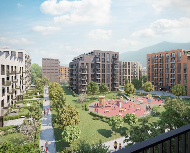 It features over 20,000 m² of parkland, landscaped green spaces, pedestrian alleyways, and playgrounds—all completely free of car access. This thoughtful design promotes a peaceful, safe, and family-friendly environment in the heart of the city.